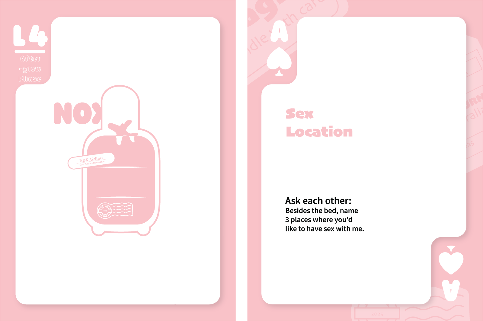 The Orgasm (Climax) stage is not the end, because it is also important for both parties to build up a perfect ending for the night! The final stage called Resolution (Afterglow) is indispensable for a perfect experience! Males experience refractory period and it is possible for females to experience multiple orgasms (Masters and Johnson Model, 1966). The Spades deck of cards can then be applied to guide users to recap the overall experience with a variety of topics. At the end of the day, who doesn’t want to end the night with sweet and delighted conversations?